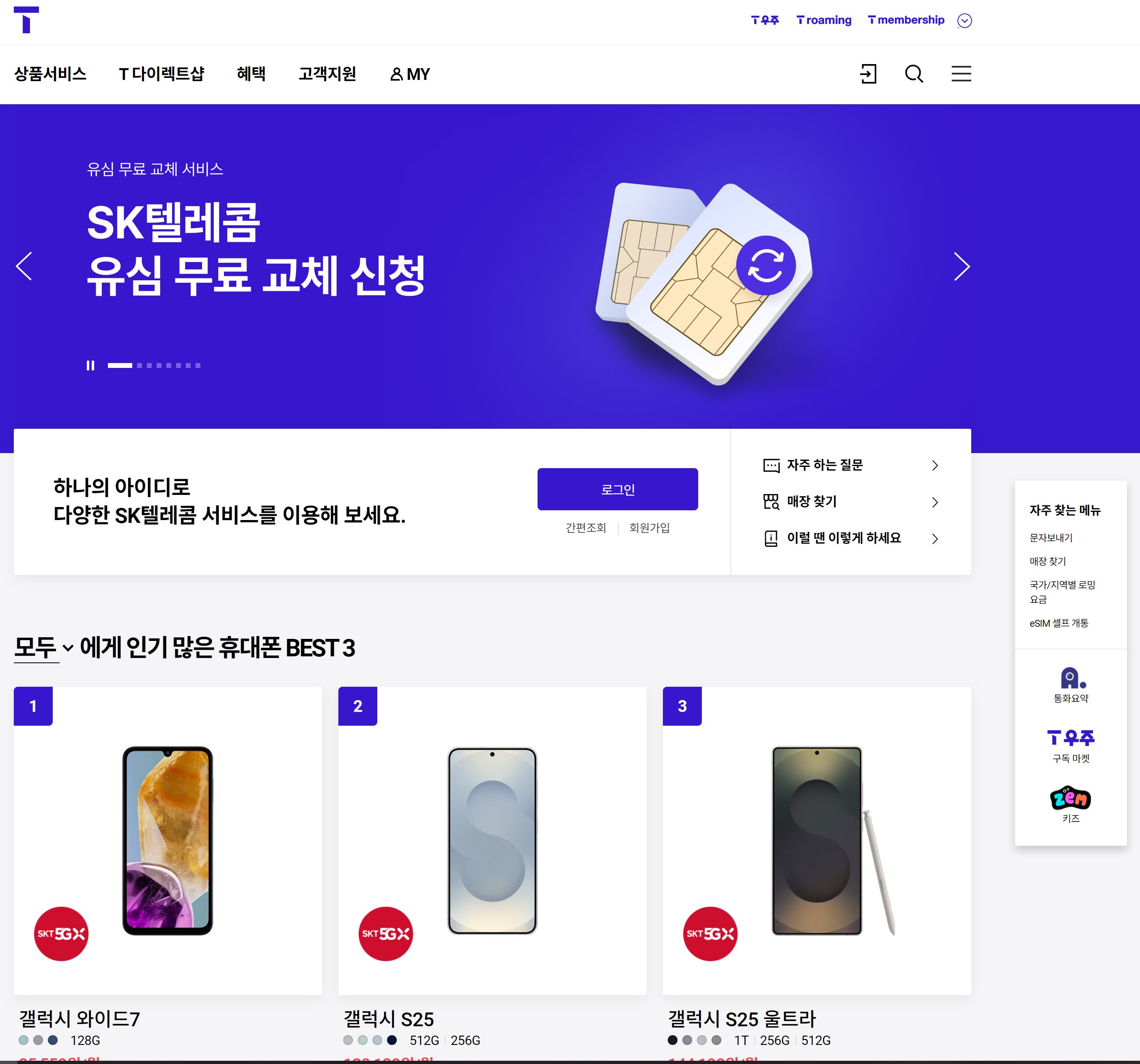 - SK텔레콤 T월드 홈페이지 접속 후 로그인.