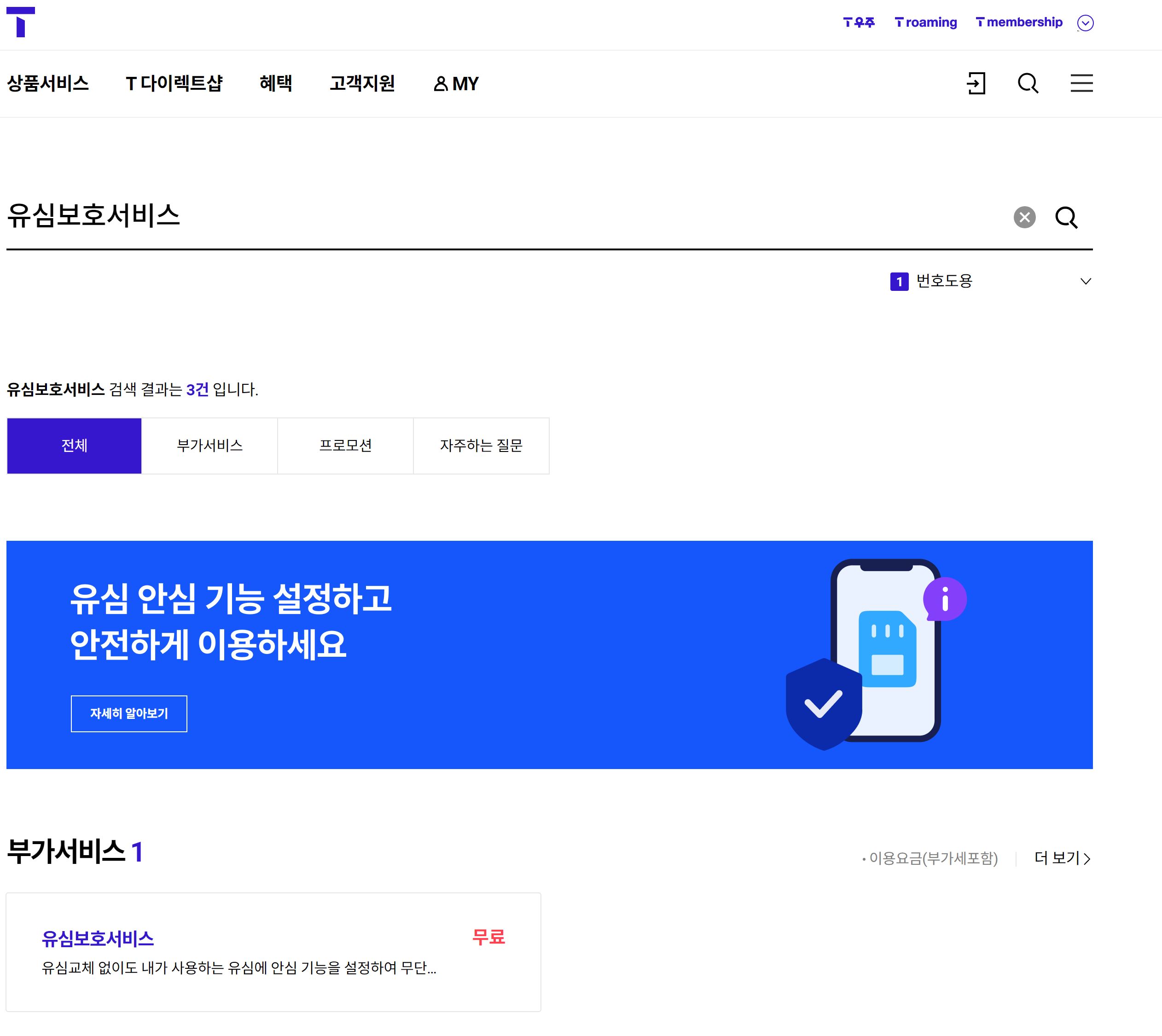 - 상단 메뉴 → 부가서비스 → 보안/안전 → SK 유심 보호 서비스 선택.